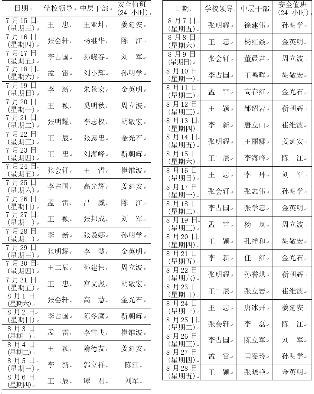 2.教職工7月15日至8月28日放假。7月11日至14日,各部門、各單位根據工作需要,采用彈性工作制度。8月29日至30日正常上班。