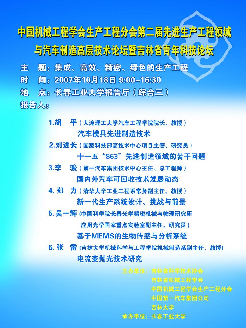 由長春工業大學承辦的中國機械工程學會生產工程分會第二屆先進生產工程領域與汽車制造高層技術論壇暨吉林省第二屆青年科技論壇將于10月18日上午9:00在綜合三報告廳舉行。